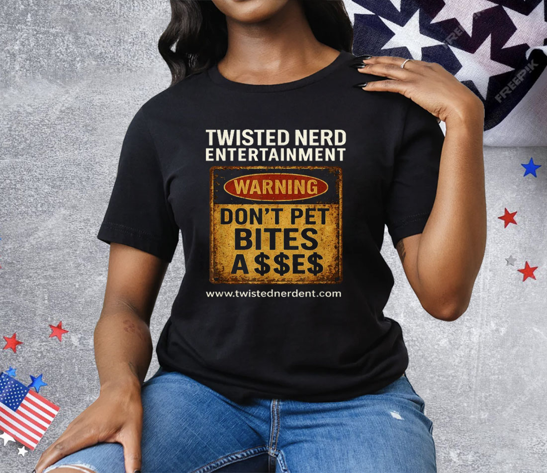 SEO Keywords: Twisted Nerd Entertainment shirt, Warning Don’t Pet Bites tee, geek culture apparel, unisex edgy t-shirt, gamer attitude shirt, playful warning graphic tee, breathable cotton shirt, convention apparel, bold nerd fashion, fun statement shirt
